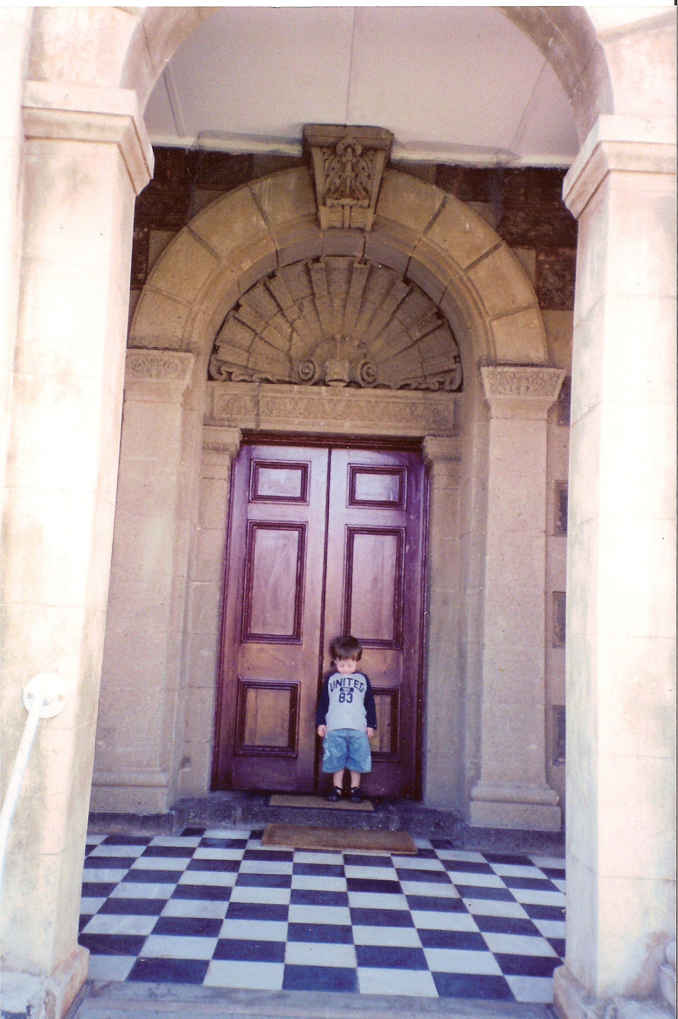 While spending a few days there a couple of years ago, my small research assistant and I, walked to the church. I was keen to see the carvings as described by Bonwick and I was pleased to see they lived up to his description. It is a little difficult to make out in the photo, but the “extraordinary monster” is in the bottom centre of the shell, its mouth is most easily seen. John Wesley is depicted in the stone above the shell. The carving directly above the door cannot be clearly seen here. Wire netting had been placed over the carvings in an attempt to protect them.