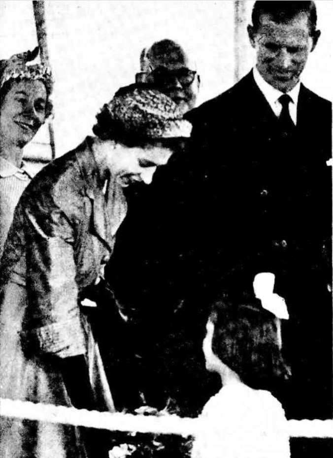 With the Queen’s plane scheduled to arrive at the Hamilton Aerodrome, to the north of the city, at 3.35pm, the Dundas Shire President, Cr. Henry Bull, his wife, and around 3000 eager locals gathered to meet Queen Elizabeth and the Duke. Young Rosemary Oates prepared to present Her Majesty with a bouquet.