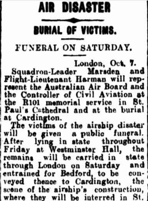 “R101 DISASTER.” The Australasian (Melbourne, Vic. : 1864 – 1946) 15 November 1930: 34 (METROPOLITAN EDITION). Web. 15 Nov 2018 http://nla.gov.au/nla.news-article140835576