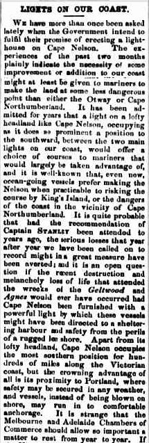 The Cape Nelson Lighthouse was fully operational in 1884 but calls for its construction came long before. One of the earliest references I have found to mention a lighthouse at Cape Nelson was in The Argus of 7 January 1864.