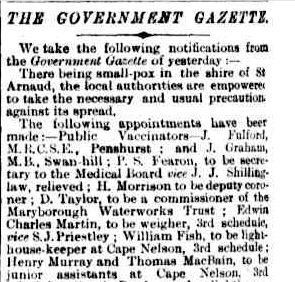 THE GOVERNMENT GAZETTE. (1884, September 6). The Argus (Melbourne, Vic. : 1848 – 1956), p. 12. Retrieved January 13, 2012, from http://nla.gov.au/nla.news-article6056910
