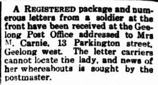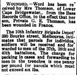 Mrs Thomson of Lower Cape Bridgewater had heard the news her son Private G.E. Thomson was wounded in France. Families of the 37th, 38th and 40th Battalions were able to send their parcels for the front to 380 Bourke Street, Melbourne. The parcels were then forwarded to the various Battalions at a cost of one penny per pound.