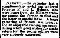 I searched the WW1 Embarkation Roll and Mapping our Anzacs trying to identify the two Holmes boys, presumably brothers. The venue of the social was not mentioned in the Editorial, so I assumed it was in Portland. The closest I found was Frederick Noah Holmes of Wallacedale and Leslie Holmes of Homerton via Heywood, however, Leslie embarked on August 1.