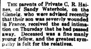 The Haines family from idyllic Sandy Waterhole on the Glenelg River received news of their son’s passing as a result of wounds.