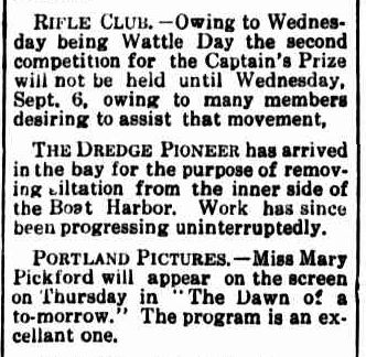 Canadian born silent screen star Mary Pickford was appearing in “The Dawn of Tomorrow” at the Portland Pictures.