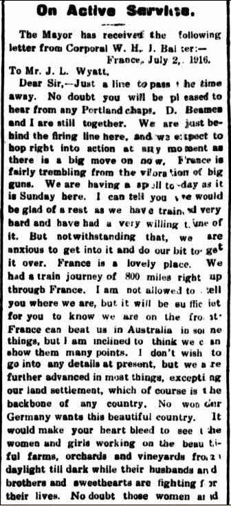 Newly re-elected Portland Mayor Mr Wyatt received a letter from local boy W.H.J.Baker, serving in France. Corporal Baker mentions “France is such a beautiful place” and “No wonder Germany wants this beautiful country”. Read the letter in full here.