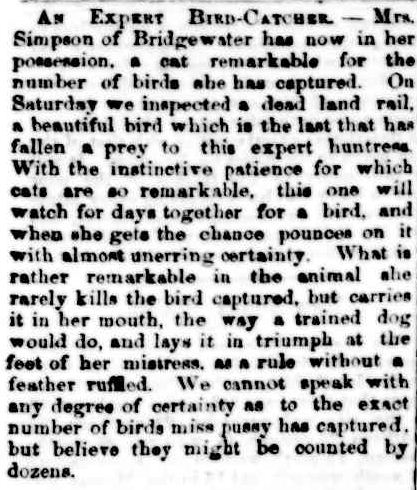 This week’s Trove Tuesday article from the Portland Guardian and Normanby General Advertiser is not an enjoyable read, but it is a reminder of the changes in attitude towards our environment and the creatures that inhabit it. In 1867, a bird hunting cat was a thing to celebrate but remember this was a time when sparrow matches and other bird shooting was popular, so please think no less of Mrs Simpson of Bridgewater. The poor bird involved was a “land rail bird”, most likely the endangered Lewin’s Rail, a small native water bird found in the south-west of Victoria.