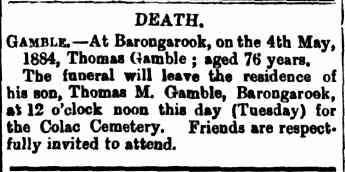 From the minutes of the Colac Hospital committee meeting, it would seem Thomas needed care but had no money and looked destined for the Benevolent Asylum at Geelong. From his Death notice, he died at this son’s home seemingly avoiding the Benevolent Asylum. Whether he was living at Barongarook waiting to go to Geelong or whether he was taken in by Thomas M. Gamble (aka Mark Thomas Gamble), at least he passed away with family around him.