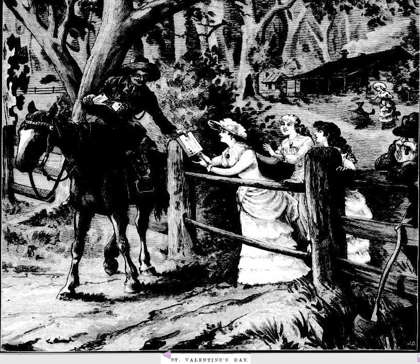 It’s two days early but this week’s Trove Tuesday has a Valentine’s Day theme. From the Illustrated Australian News of 21 February 1883, comes “Bush Valentine”. Valentine’s Day was not the postman’s favourite day of the year as his workload increased significantly but whether he came by horse or bicycle, his arrival caused great excitement.