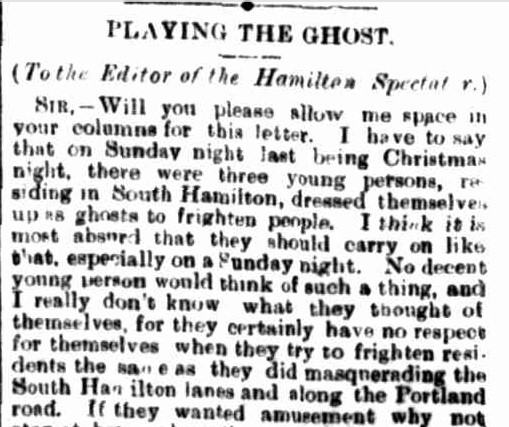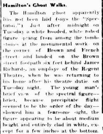 I have previously written about paranormal activities in Hamilton for Trove Tuesday when residents thought War of the Worlds had come to town.  Now I bring you the story of the Hamilton ghost.  Well, actually four stories but not all of the same ghost, and on one occasion, the Hamilton apparition drifted out of town to Macarthur.