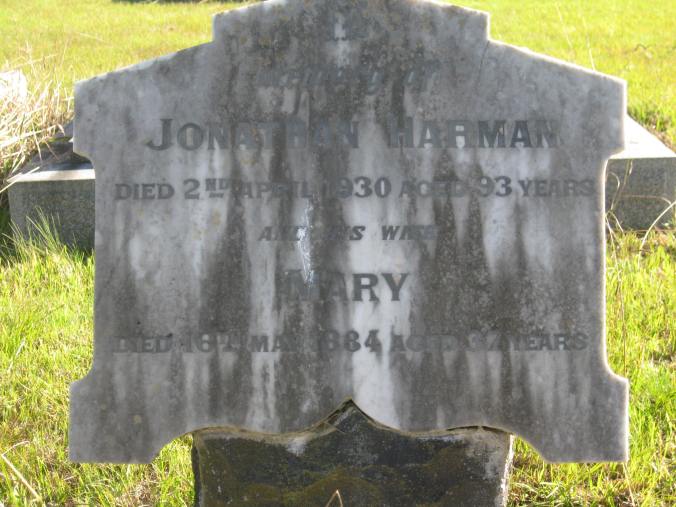 Jonathan HARMAN: Died April 1930 at Heywood. Jonathan Harman, my ggg uncle was also from a family known for longevity. He died at the home of his daughter, Amelia, wife of the nephew of James Bell (above). Jonathan was ninety-two years old and a colonist of seventy-six years. Johnathon was buried with his wife Mary Oliver at the Byaduk Cemetery.