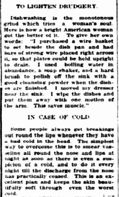 If you want to make dish washing less of a chore, here is a handy hint courtesy of an American housewife. Or if the cooler weather has caused your nose to run, be sure to apply Vaseline around your nose and mouth area before bed tonight.