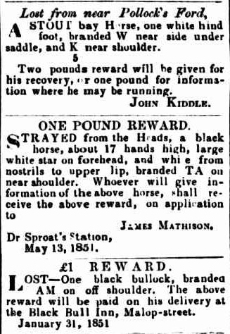 In almost every paper there were lost and found horses and other stock. Inappropriate fencing or no fencing at all would have meant a roaming animal was a common sight.