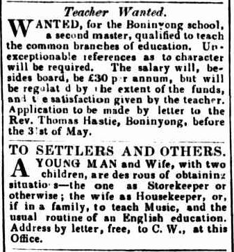 The Rev. Thomas Hastie was looking for a teacher of the Boninyong School (now Buninyong) i 1851. In Geelong, a couple with children were looking for work, him as a storekeeper and her as a housekeeper or teacher.