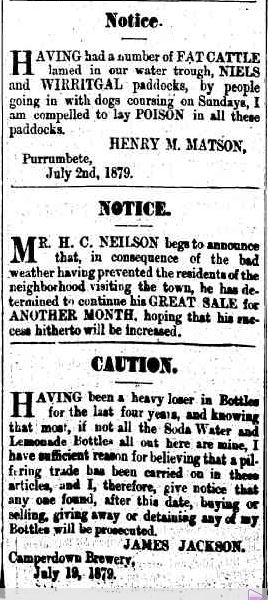Henry Matson of Purrembete, tired of coursing parties in his paddocks leading to injury to his stock, threatened to lay poison in the paddocks. James Jackson of the Camperdown Brewery was also fed up. Fed up with his soda water and lemonade bottles going missing. He was going to sue basically any person with one of his bottles in their possession.