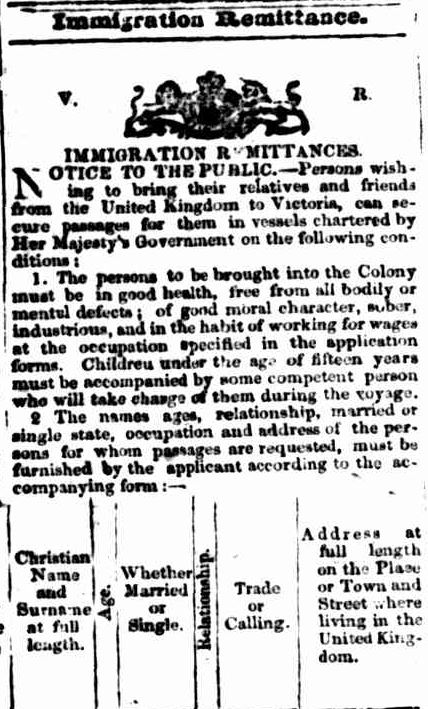 The following Immigration Remittance is an interesting notice and it had me thinking if I had any relatives that may have arrived in Victoria under the scheme described.