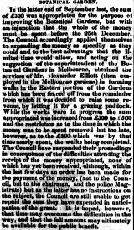 Works began in 1858, assisted by Alexander Elliot from the Royal Botanic Gardens in Melbourne, however, a lack of funds was slowing progress.