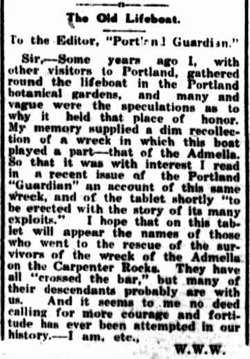 Three years later, “Wandering Willie’s Wife” wrote to the editor again, prompted by the announcement that a “tablet” with the story of the lifeboat Portland would be placed beside the boat.