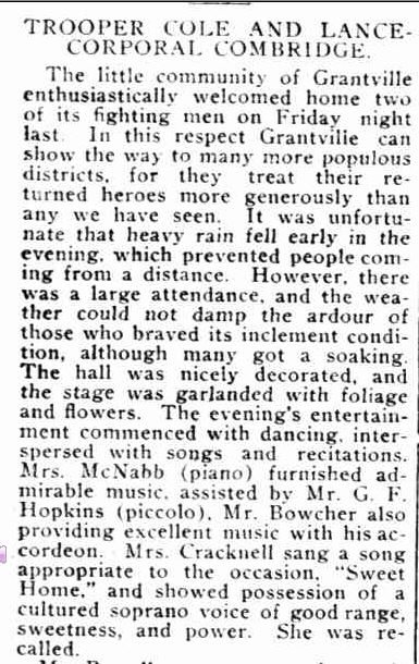 That was the case when the Lang Lang Guardian (1914-1918) came online recently. For the 2013 Anzac Day Blog Challenge, I wrote about my grandfather Les Combridge so it was pleasing to find the following article from June 21, 1918, that adds to his story . It is a report on the return home of two Grantville “fighting men” Trooper Cole and Lance Corporal Combridge. Aside from what I learnt about Les, this article paints a lovely picture of a small town gathering during that time. There is the decorated hall, singing and of course supper…ladies a plate please.