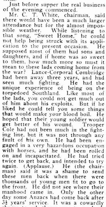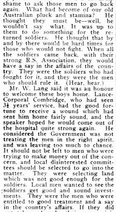 So what can I glean from this article. Firstly, there is confirmation that Les was on the troop ship “Southland“. Also the chair for the night was his future father-in-law, Culmer White. There is a reference to the difficulties faced by returned serviceman and lack of Government support, giving us an idea of the tone of public opinion during those times.