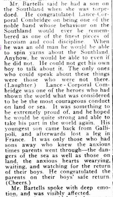 The saddest part of this article is the speech by Mr Bartells. He told Les that he could “spin yarns” about the bombing of the “Southland” when he was an old man. Les never became an old man. He died 19 years after that night in the Grantville hall, aged 40. He would have take those yarns to the grave.