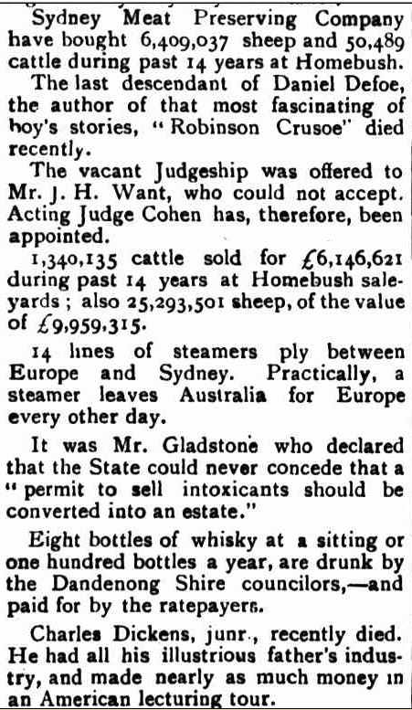 This offering from September 12, 1896, includes ostriches and Chow dogs, Daniel Defoe and Charles Dickens Jnr. Public officials were put to task, such as Judge Windeyer and his questionable penison and the Dandenong Shire Councillors, believed to have consumed one hundred rate-payer funded bottles of whiskey over the course of the year. There are statistics aplenty and court news.