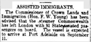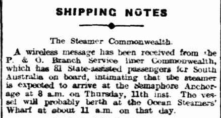 ASSISTED IMMIGRANTS. (1913, August 8). The Register (Adelaide, SA : 1901 – 1929), p. 6. Retrieved September 14, 2013, from http://nla.gov.au/nla.news-article60056064