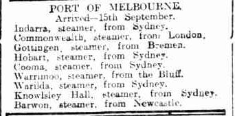 SHIPPING INTELLIGENCE. (1913, September 16). The Argus (Melbourne, Vic. : 1848 – 1957), p. 14. Retrieved September 14, 2013, from http://nla.gov.au/nla.news-article7233086