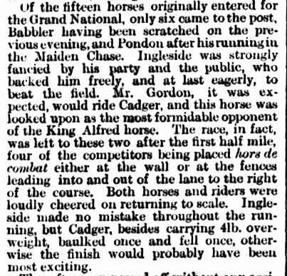 In the feature race, Adam Lindsay Gordon rode Cadger owned by Walter Craig, then proprietor of the well-known Craigs Hotel in Ballarat.  Gordon set the pace and with the remaining four horses dropping off, Cadger and Ingleside were left to fight it out.  The rough and tumble of colonial racing and the fearlessness of Gordon was on display in the final stages of the race.  Cadger baulked at a jump, but Gordon faced him up at again and was able to clear it on the second attempt.  The chase was on but Cadger fell further down the track.  Not to be perturbed, Gordon remounted and continued the race.  Unfortunately, Ingleside had too much of a lead and Gordon and Cadger were beaten by around 12 lengths.