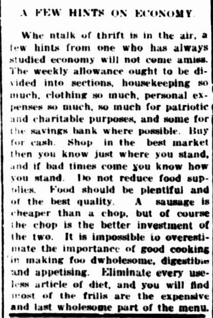 A FEW HINTS ON ECONOMY. (1917, April 18). The Colac Herald (Vic. : 1875 – 1918), p. 5. Retrieved October 6, 2013, from http://nla.gov.au/nla.news-article74520295