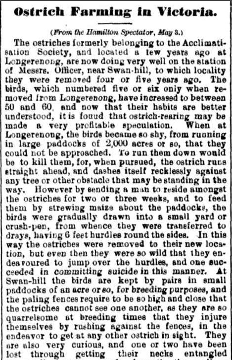 - Ostrich Farming. (1885, January 13). Kerang Times and Swan Hill Gazette (Vic. : 1877 – 1889), p. 4. Retrieved October 15, 2013, from http://nla.gov.au/nla.news-article65601344