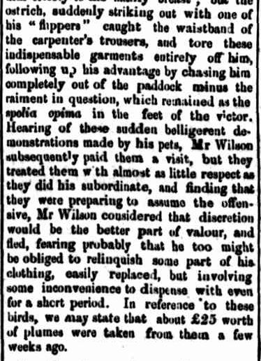 It was a wish to have a touch of home that saw plants and animals introduced from England in the mid to late 19th century, some with dire results. Other exotic animals arrived too, such as monkeys. But it was ostriches that offered a monetary return, with their feathers in demand in the fashion industry. However, ostrich farming was not all it was cracked up to be, as Samuel Wilson of Longerenong and an unsuspecting carpenter found out in November 1868. The ostriches, owned by the Acclimatisation Society of Victoria, were acclimatising at Wilson’s property and had given the first impression they were tame, but as the two men found out, “familiarities are likely to breed contempt”