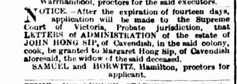From there, I learnt of the sad demise of Hong Sip. On 13 December 1884, while working at Muntham Station near Coleraine, Hong Sip was callously assaulted. Two men, John Fleming and George Traill, were arrested for the assault. On 12 January 1885, Hong Sip was admitted to the Hamilton Hospital with inflammation of the lung and died there on 28 January. The charges against Fleming and Traill were upgraded to manslaughter, and Margaret gave evidence at the trial. They were found guilty, and Fleming served three months imprisonment and Trail, two months.