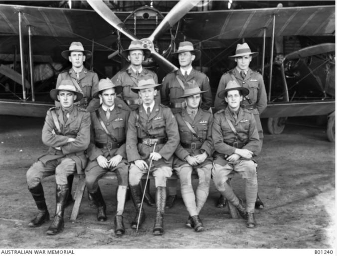 CHARLES HARMAN (Back row, 2nd from left) WITH THE COMMANDING OFFICER AND FLIGHT COMMANDERS OF NO. 1 SQUADRON AFC AT PALESTINE NOVEMBER 1918. Image courtesy of the Australian War Memorial https://www.awm.gov.au/collection/C960630