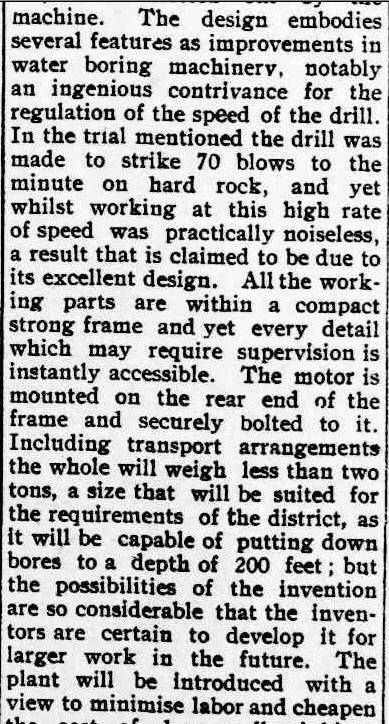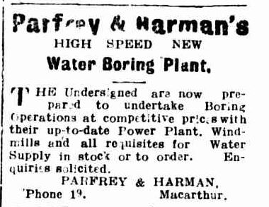 By January 1915, Charles and Arthur had their water-boring plant up and running and available for hire. Business was brisk with dry conditions prevailing.