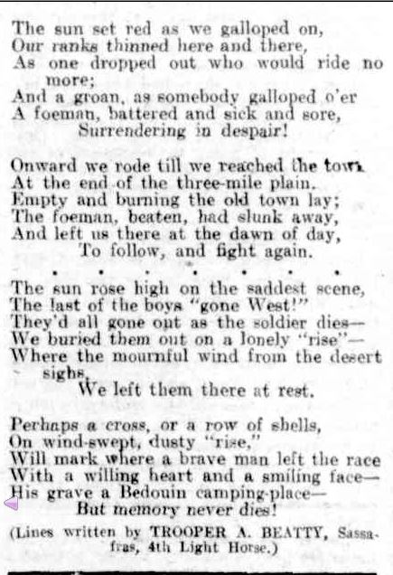 But nothing can go past recollections of those that were at Bersheeba such as the following poem by Trooper Arthur Beatty of Sassafras written in 1918 remembering those buried in a “Bedouin camping place”