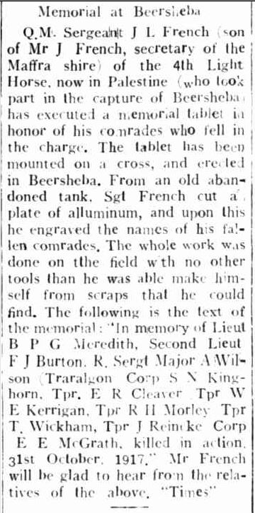 Memorial at Beersheba. (1918, May 14). Gippsland Farmers Journal (Traralgon, Vic. : 1914 – 1918), p. 2. Retrieved April 21, 2014, from http://nla.gov.au/nla.news-article88057978