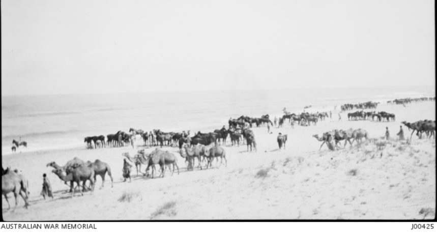4th LIGHT HORSE REGIMENT BATHING HORSES & CAMELS, MARAKEB, PALESTINE, 1917. Image Courtesy of the Australian War Memorial Image No. J00425 http://www.awm.gov.au/collection/J00425/