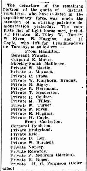 It was not just men leaving Hamilton.  Fourteen horses, donated by prominent local breeders, including James Learmonth of Melville Forest, also said goodbye to their breeding grounds and like the men, were oblivious to what lay ahead of them.  The mood was buoyant and locals provided gifts for the men including cigarettes and a box of cigars, from Mr Short, brother-in-law of Private Maurice Tilley.  The parade moved along the streets of Hamilton to the Town Hall, accompanied by the Hamilton Pipe Band.