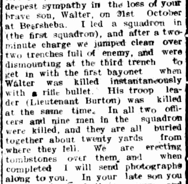 In contrast to the deserts of Palestine, back at home in Western Victoria, the spring grass was abundant, lambs were fattening and the local P&A Agricultural show season was underway.  News of Walter’s death, however, began to reverberate from Byaduk by mid-November 1917.  His death was felt as far away Trawalla, west of Ballarat,  home to Walter’s sister Flora. Reports appeared in both the Ballarat Courier and the Ripponshire Advocate.