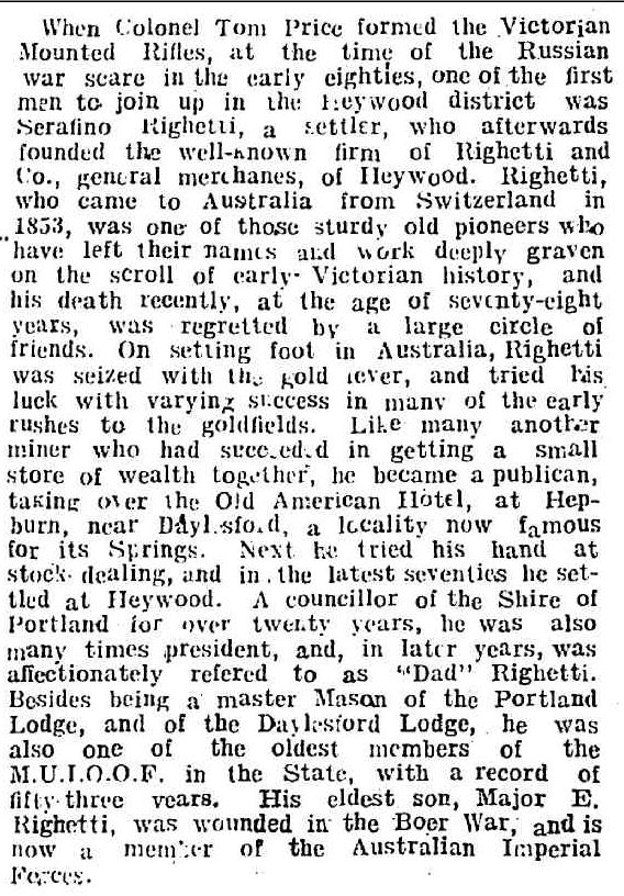Serafino RIGHETTI: Died 21 December 1917 at Heywood. I first “met” the Righettis of Heywood when I wrote the Trove Tuesday post “Accidental Tourist”. I didn’t realise then that the family was one of the Swiss/Italian families that settled at Hepburn near Daylesford after arriving in Victoria during the 1850s. Serafino was born in Switzerland and arrived in Melbourne in 1854. His brother Battista arrived the following year. A photo of Serafino and Battista appears on the following link – http://tinyurl.com/l4o5k5n