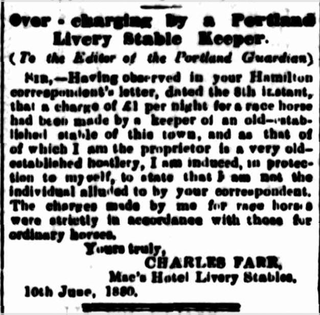 “Over – charging by a Portland Livery Stable Keeper.” Portland Guardian (Vic. : 1876 – 1953) 12 Jun 1880: 3 Edition: MORNINGS.. Web. 27 Dec 2014 <http://nla.gov.au/nla.news-article63401212>.