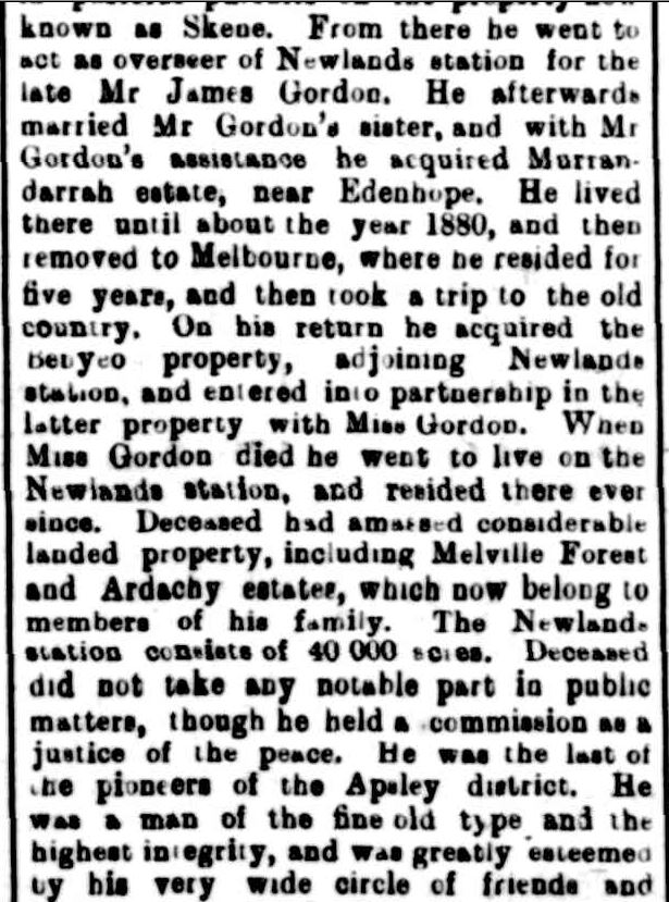 Walter LAIDLAW: Died December 1906 at Apsley. Walter Laidlaw was born in Scotland around 1825. He arrived in Victoria in 1850 and with the discovery of gold, he tried his luck on the Bendigo diggings. He then farmed at Broadmeadows before moving to the Western District, farming on the land that became known as Skene at Strathkellar. He was then appointed overseer of Newland Station at Apsley for James Gordon and in time, married his employer’s sister. At the time of his death, he owned Ardachy Estate and Melville Forest Estate.
