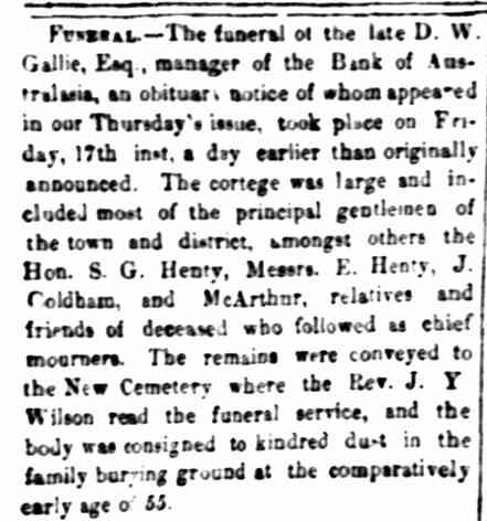 The funeral of David Gallie was well attended with “most of the principal gentlemen of the town and district” there to pay their respects. They included brother-in-law Edward Henty and his brother Stephen Henty.