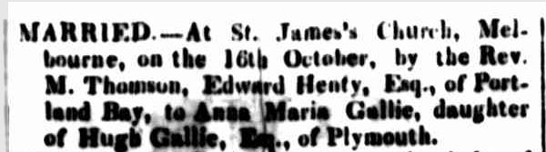 In 1840, David’s sister, Anna Maria married Edward Henty of Portland at St James Church in Melbourne.