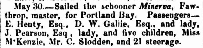 The Minerva was owned by the Henty Brothers and Captain Fawthrop her master. The Henty’s used the schooner to transport goods and sheep between the two colonies.