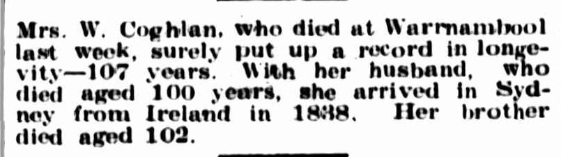 John COGHLAN: Died 8 January 1918 at Garvoc. John Coghlan was an early native of the Colony of Victoria, born at Eastern Hill, Melbourne around 1841. His father, William Coghlan, was a landholder in Melbourne but sold his properties and moved to the Western District, taking up land at Port Fairy. The family next moved to Warrnambool, living at a property on the Merri River, and John’s father continued to farm. After his marriage to Miss Patton, John and his wife moved to Cooramook near Grassmere and then later on to Garvoc around 1878, purchasing the property Pine Hills where he engaged in dairy farming. According to the obituary, John did not live as long as his parents. His father William lived to ninety-seven while his mother apparently lived to 107. John was buried at the Terang Cemetery.
