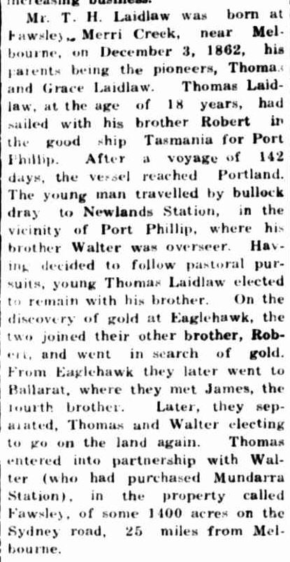 Thomas LAIDLAW: Died 12 January 1915 at Macarthur. Thomas Laidlaw was born in Scotland in 1833 and arrived with his brother Robert to Victoria around 1851. He headed to Newlands Station near Harrow to work with his brother Walter Laidlaw, a Passing of the Pioneers subject last month. A description of Thomas’ arrival was in his obituary and that of his son Thomas Haliburton Laidlaw, a Passing Pioneer in September 2011.