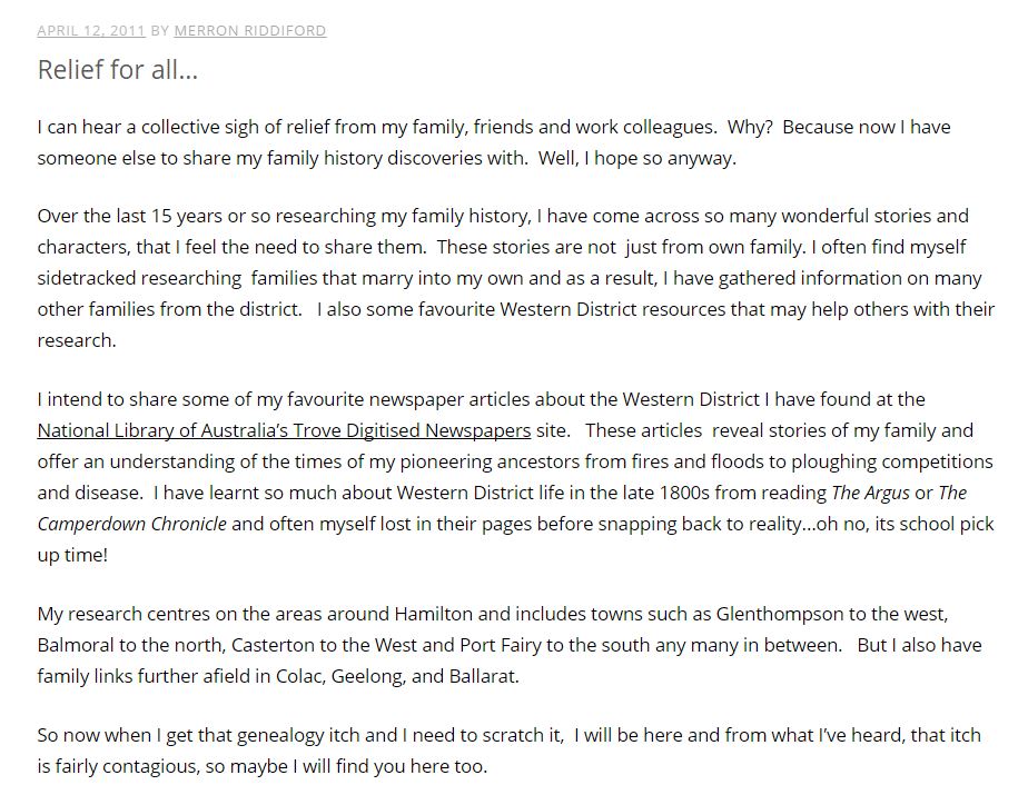 Exciting news came in September last year when the State Library of Victoria contacted me to include Western District Families in the National Library of Australia’s Pandora Archive. How could I say no to that? It means WDF posts now show in search results at Trove and if Western District Families ever ceases to exist, it will always be available at Pandora.
