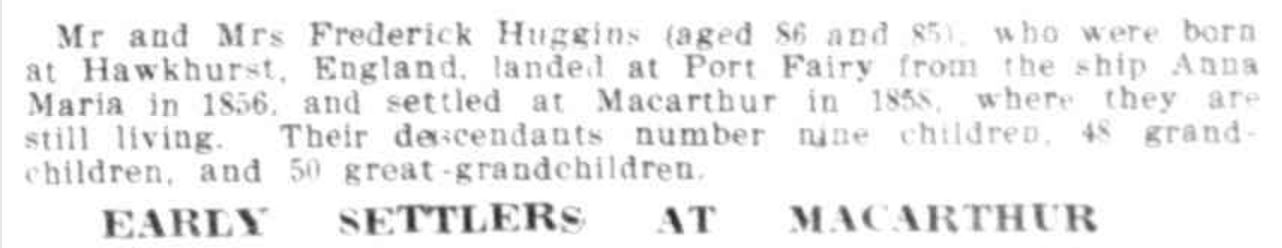 “EARLY SETTLERS AT MACARTHUR” Weekly Times (Melbourne, Vic. : 1869 – 1954) 6 September 1919: 25. http://nla.gov.au/nla.news-article222567748